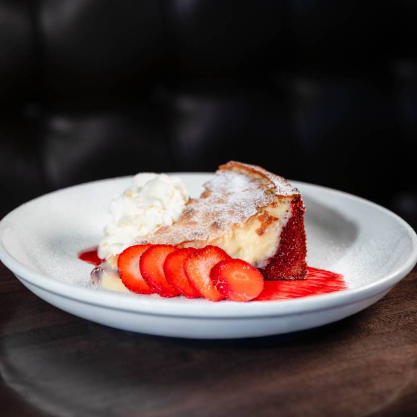 Red velvet butter cake, vanilla, cream cheese, raspberry coulis, strawberries, powdered sugar