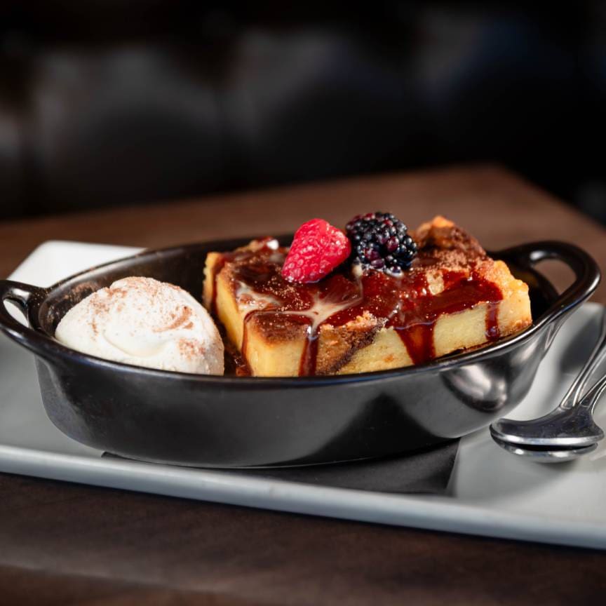 Brioche bread, warm chocolate fudge, strawberry-vanilla custard, vanilla bean ice cream